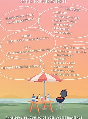 Dieses Jahr wollen wir mit euch zusammen an den Ebnisee gehen, geneinsam grillen - chillen - und einfach eine schöne Zeit zusammen haben. Eventuell drehen wir auch noch eine Runde mit dem Boot. Seid ihr dabei?