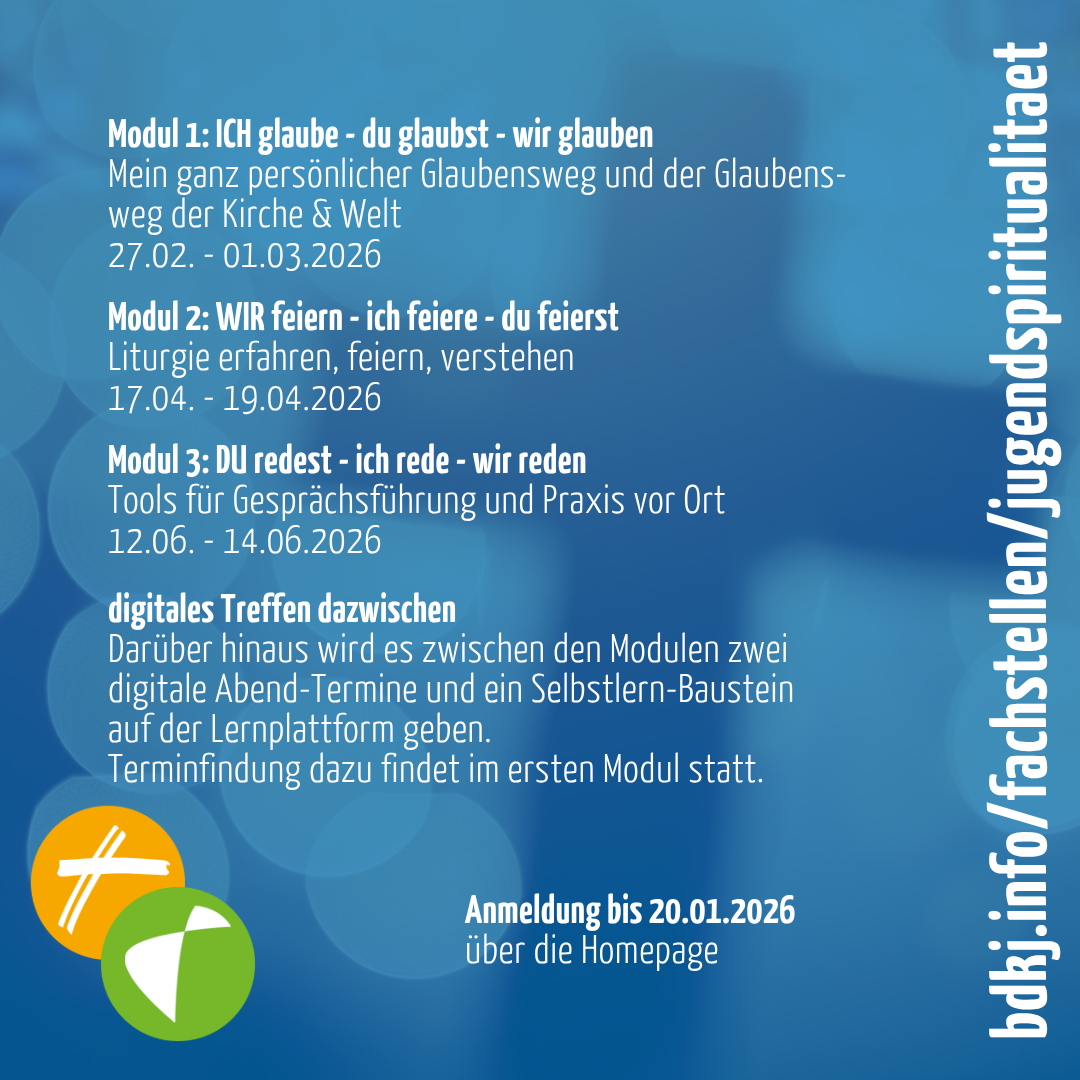 Mit neuem Konzept, in verändertem Format – analog, digital und auf der Lernplattform – und anderer, inhaltlicher Schwerpunktsetzung startet ab Februar 2026 der „Glauben konkret“/ AGL (Ausbildungskurs Geistliche Leitung)-Kurs. Der Kurs ist für alle angehenden oder bereits gewählten geistlichen Leitungen in den Verbänden, in den BDKJ-Dekanatsstrukturen oder auf Gemeindeebene gedacht, für Freizeiten-/ Lagerseelsorger*innen, jugendliche Katechet*innen in der Firmvorbereitung, einfach am Glauben und Spiritualität interessierte junge Erwachsene,…