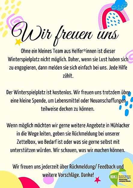 Wenn auch sie uns unterstützen möchten, indem sie zB ehrenamtlich aktiv sein wollen beim Winterspielplatz, dann melden sie sich doch einfach bei Agnes Ferlein vom Jugendreferat aferlein@