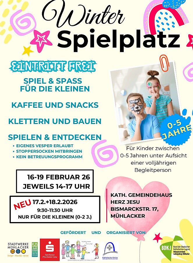 Unser Winterspielplatz ist geöffnet vom 16.02. - 19.02.2026 jeweils von 14 bis 17 Uhr im Kath. Gemeindezentrum Herz Jesu, Bismarckstr. 17 in Mühlacker